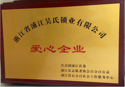 公司因在公益事业方面的突出表现,被共青团浦江县委、浦江县志愿者协会百分百公益、浦江县百分百社会工作服务中心授予“爱心企业”荣誉称号。